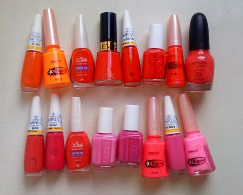 Para esse verão, percebi que todas as mulheres estão ousadas nas cores, e não querem mais saber de vermelho e vinho, eu sou uma delas que estou fazendo a unha 2x por semana, porque estou cansando muito fácil dos esmaltes. A dica é abusar de todos os tons alaranjados e rosas, e quando cansar passe um Nude que não tem erro, aliás para quem muda de esmalte na mão toda hora que nem eu, passe Nude nos pés e se joga no fluor nas mãos!